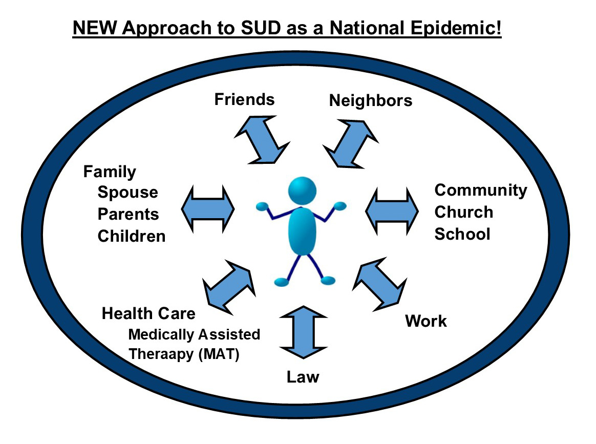 Current treatment for a person with a Substance Use Disorder could be characterized as “Go fix yourself, and then come back!”. Substance use creates all kinds of negative behaviors, which cause problems for others and lead to rejection and isolation. “Getting help” is often an individual task, which others are not usually involved with. Old prejudices and stigma about the disorder further worsen the situation. Laws have been punitive and filled our courts and jails, instead of “Getting help”. Obtaining a prescription for necessary therapeutic medications (MAT) has been highly restricted. Help for families does occur, largely on an individual basis or in selfhelp groups (Nar-Anon).